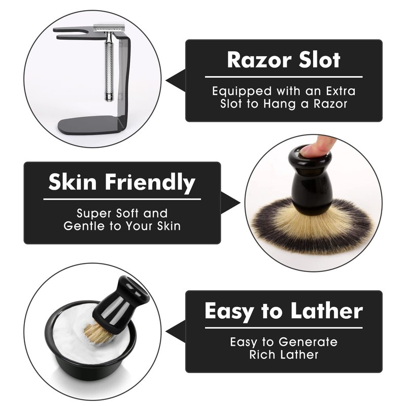 - 🔗【Compact Stand】It has a slot for a razor, and also has room for holding your shave brush and bowl so that your shave kit can fit in a minimal perfect space. You can put them next to the sink for easy use or store them inside a cabinet. The sleek black finish makes the shaving kit for men look elegant and professional, complementing the bathroom decor. Note: Please remove the protective film of the stand before use, and put the shaving bowl and brush set in a flat position to avoid tipping.