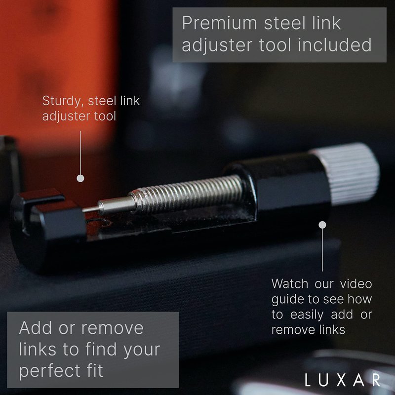 - ☑️ ADJUSTABLE SIZE - one size fits all men (up to a maximum of 9" wrist circumference - additional links are available on request if a larger size is required - please just send us a message!) Use the premium quality steel Luxar link adjuster tool to add or remove links for the perfect fit [adjuster tool included].