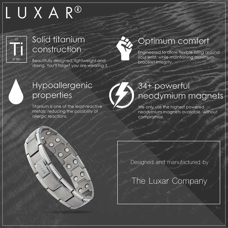 - ☑️ TRUSTED BY THOUSANDS OF CUSTOMERS - Luxar presents our solid titanium magnetic linked bracelet, with an elegant brushed titanium finish. Titanium is one of the strongest, lightest and most durable metals on Earth. The lightweight nature of titanium results in an incredibly comfortable bracelet, so light you’ll forget you’re wearing it.