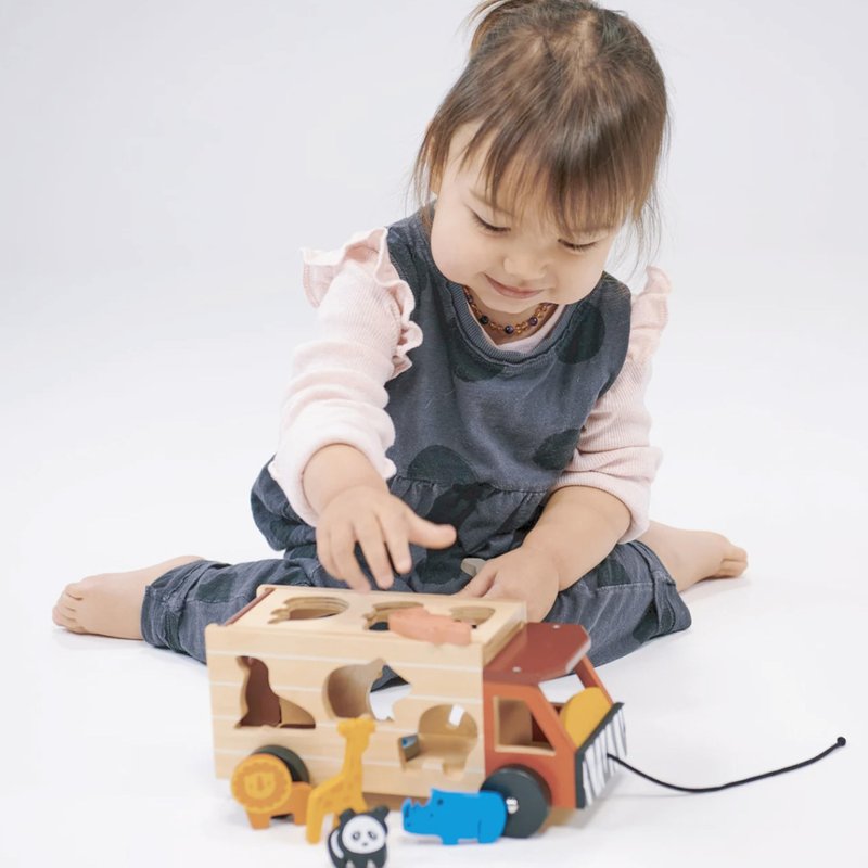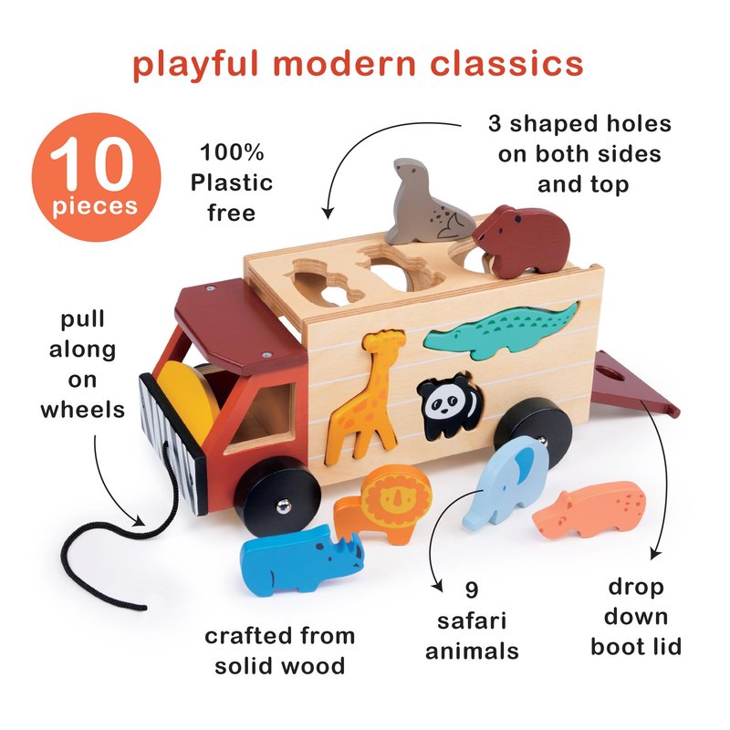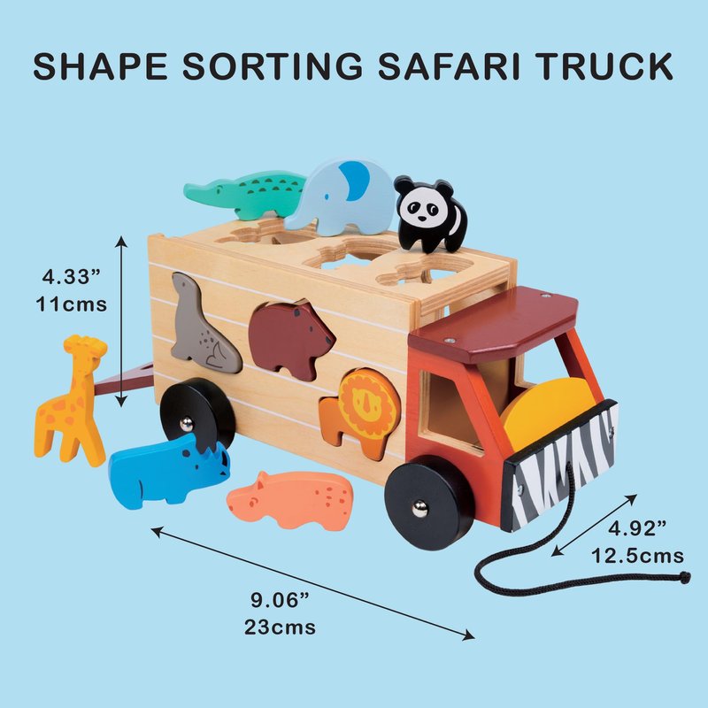 - SHAPE SORTING ON SAFARI! - This colorful safari truck is on a mission to round up all the animal friends, from a tall giraffe to a snappy crocodile, a cuddly panda to a mighty lion. With 4 wheels and 3 sides full of animal-shaped cutouts, your little explorer will have a roaring good time matching each creature to its perfect spot. Once all the animals are safely on board, drop down the boot lid to set them free for the next safari!