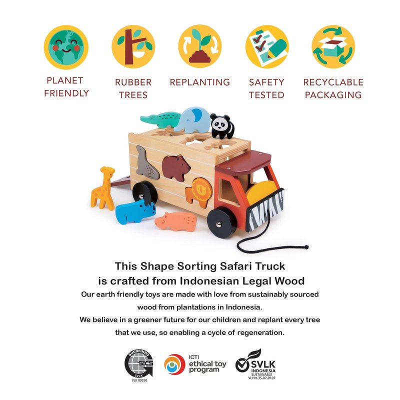 - CHILD FRIENDLY PIECES - Made from high grade wood with non-toxic paint, this eco-friendly shape sorter is as playful as it is educational. The set comes with 9 animal pieces and the safari truck with a drop down back panel and front pull chord. Dimensions 9.06 x 4.92 x 4.33 inches.