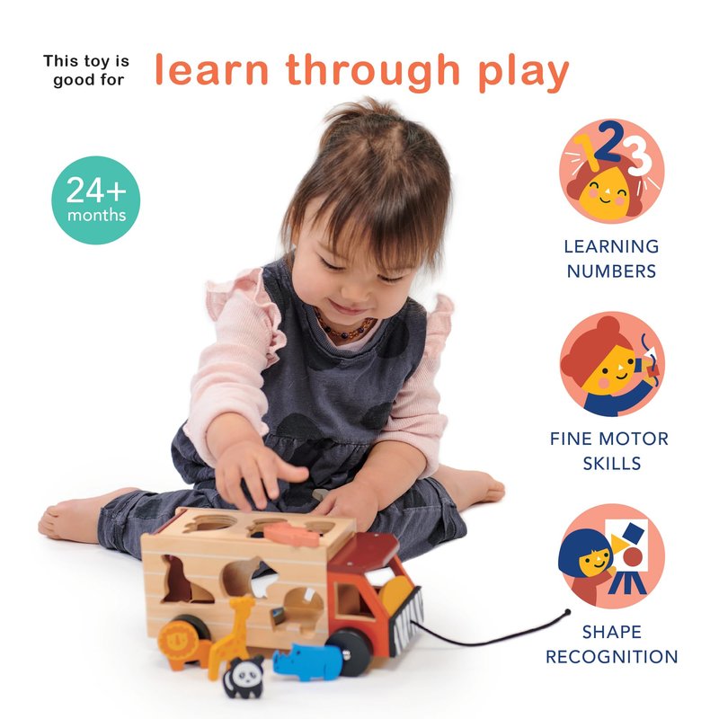ROAR INTO LEARNING: SHAPE SORTING SAFARI ADVENTURE Get ready for a wild adventure with the Shape Sorting Safari Truck! This colorful safari truck is on a mission to round up all the animal friends, from a tall giraffe to a snappy crocodile, a cuddly panda to a mighty lion. With 4 wheels and 3 sides full of animal-shaped cutouts, your little explorer will have a roaring good time matching each creature to its perfect spot. Once all the animals are safely on board, drop down the boot lid to set them free for the next safari! Not only is this safari truck a ticket to endless imaginative play, but it also helps kids develop essential skills like hand-eye coordination, fine motor control, and problem-solving. As they sort and match each animal, they'll be building their brainpower while having a trunkful of fun! So, buckle up and let the Shape Sorting Safari Truck drive your child's development to new heights!