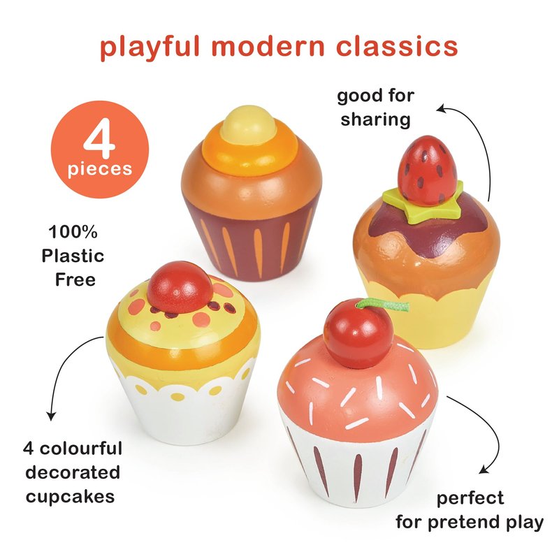 - SWEETEN UP PLAYTIME - This delightful wooden play food set includes 4 brightly colored, beautifully decorated cupcakes that are almost too cute to 'eat.' Perfect for little hands and big imaginations.