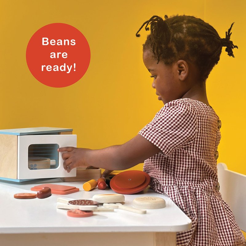 PLAYTIME SERVED HOT! Get ready to microwave your way to fun with our Toy Microwave! This wooden pretend playset is perfect for whipping up an imaginary feast or heating up some meals on the go - without the mess! The set comes with everything your little chef needs: a cup with removable whipped cream (perfect for that hot chocolate fix), a plate, and a Tupperware-style box filled with a sausage, baked beans, and broccoli. With its clacking knob, push buttons, and opening door, this microwave will have them cooking up ideas in no time! Not only is it fun, but it also teaches valuable lessons about not wasting food, while sparking creativity and fine motor skills. It's the ultimate recipe for learning and play!