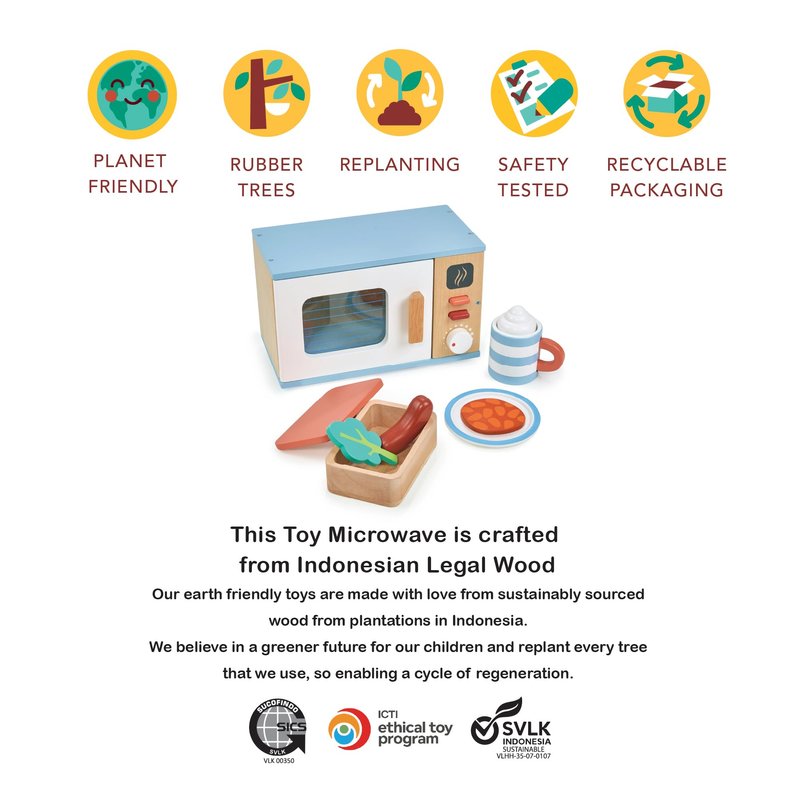 - HEAT, EAT AND REPEAT! - This wooden pretend playset is perfect for whipping up an imaginary feast or heating up some meals on the go - without the mess! The set comes with everything your little chef needs: a cup with removable whipped cream (perfect for that hot chocolate fix), a plate, and a Tupperware-style box filled with a sausage, baked beans, and broccoli. With its clacking knob, push buttons, and opening door, this microwave will have them cooking up ideas in no time!