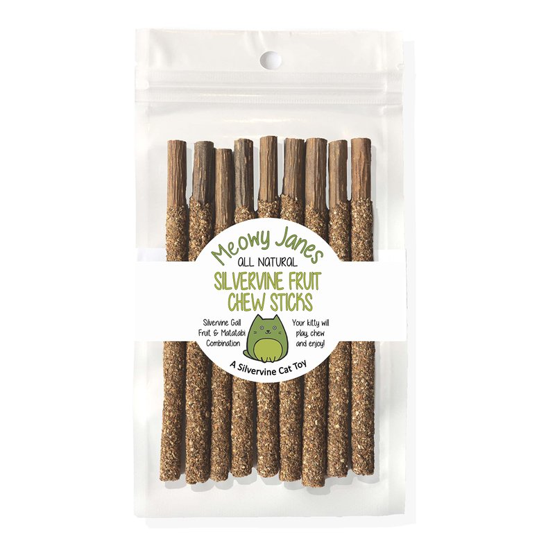 A more potent form of our Matatabi sticks that also helps maintain healthy teeth! Packed into our Silvervine Coated Matatabi Sticks are naturally occurring essential oils that drive cats wild. The added silvervine gall fruit powder makes these even more enticing than plain Matatabi sticks. Give one to your cat as is or gently rub off a little bit of the powder and bark of the stick to release the scents from the natural oils- then give to your cat to enjoy. They will play, roll, rub, and have a blast! ==What's in the bag?== + The resealable bag is stuffed with 9 Silvervine Powder Coated Matatabi sticks. + All sticks are dried, unprocessed, and untreated vine segments, coated with our all natural silvervine powder made by finely grinding the gall fruit of the silvervine plant. +The "glue" to hold it all together is a non-toxic plant based adhesive. + Each stick is around 5 inches long and safe for cats to tear bits off during play. ==What is Matatabi?== + The plant is native to the mountains Japan and China and grows like an ivy on trees and rocks. It is officially named Actinidia Polygama, but is commonly called Silver Vine for the distinctive color of its leaves. + Many cats react to Matatabi (the vine of the Silvervine plant) even if they show little interest to catnip. A 2017 scientific study found 70% of cats had a reaction to catnip, however over 80% of cats had a reaction to silvervine, with many cats enjoying both! + While Matatabi/ Silvervine is slowly becoming more well known here in the United States it is more popular in East Asia than traditional catnip!