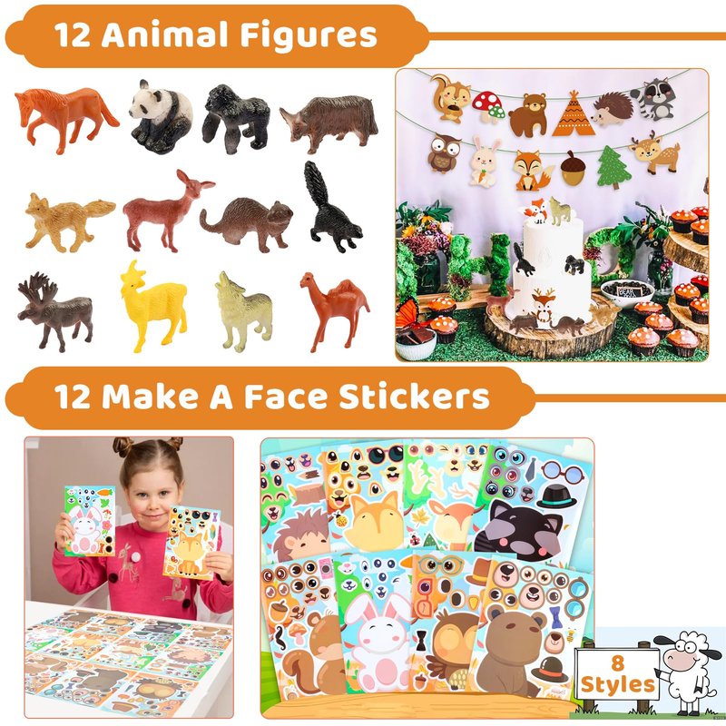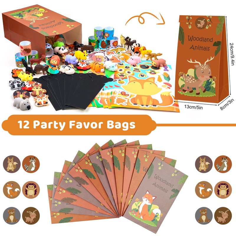 - BEST VALUE WOODLAND ANIMAL PARTY SUPPLIES DECORATIONS - Contains the most popular woodland animal elements on the market: the woodland animals keychains, the jungle themed make a face stickers and scratch art kit and more. The favors can be put into 12 cute goodie bags separately, all these will be a big hit for kids!