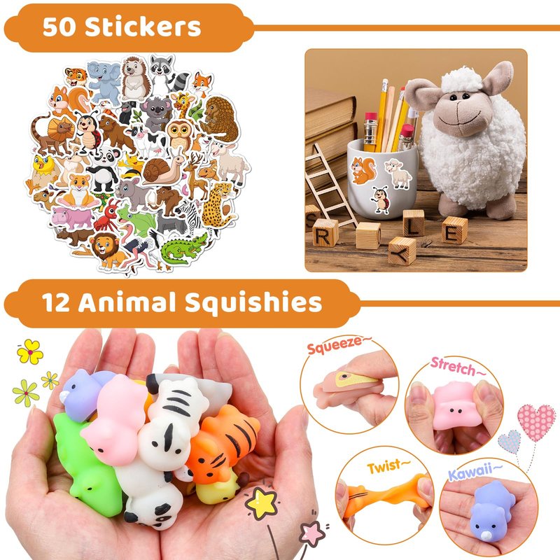 - 134 PCS WOODLAND PARTY FAVORS FOR 12 KIDS - Includes 50 woodland animal stickers and other 7 style woodland themed favors, 12 of each: animal keychains, slap toys, mini animal figures,scratch art set, make a face stickers, woodland animal squishies and goodie bags.Perfect for Birthdays, baby showers, and woodland-themed party.