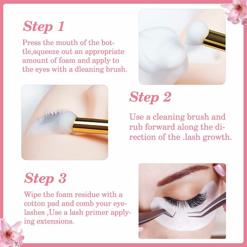- 💕Home use Eyelash Extension Cleaner– Apply small amount of lash shampoo on the brush or finger by pressing on the foaming pump head. Work the brush up and down along the lashes in gentle movements. Rinse it off with water.