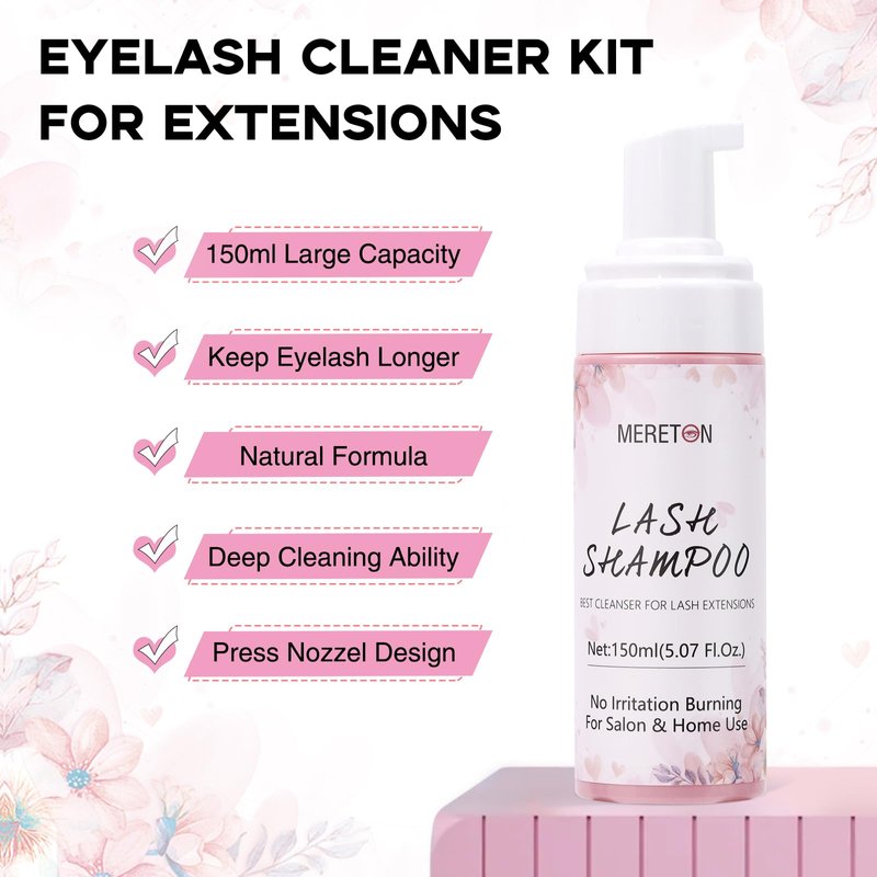 MERETON 150ml Lash Shampoo for Lash Extensions, Eyelash Extension Cleanser Lash Cleaning Kit for Cluster Lashes with Fan+Makeup Pad+Cleaning Brush+100 Pcs Lash Brush+Wash Bottle, Oil Free Foam
