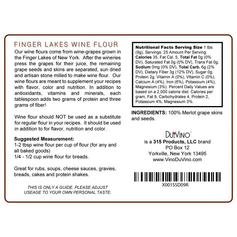 - MADE FROM GRAPE SKINS AND SEEDS- No other additives, colors, dyes, sweeteners, sodium or preservatives. Our wine flour comes solely from wine-grapes grown in the Finger Lakes Region of New York. Wine flour CONTAINS NO ALCOHOL.