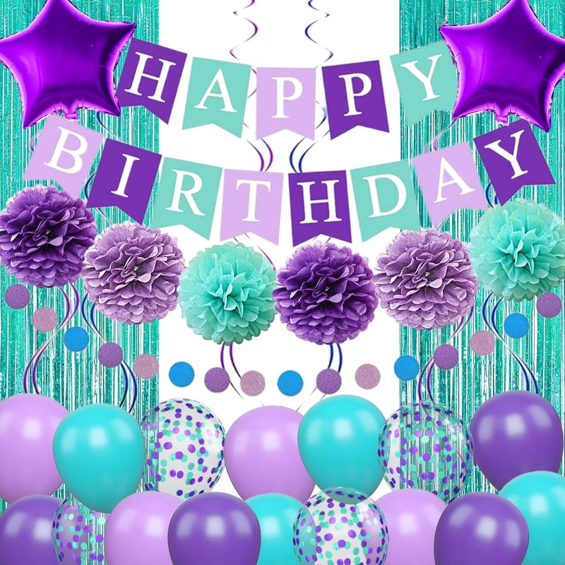 π Make birthday a truly memorable occasion with our stunning Purple Teal Birthday Party Decorations for her. This comprehensive mermaid party decoration set is perfect for mermaid unicorn birthday party, wedding party decoration, baby shower, bridal showing, wedding, engagement, anniversary, New Year party decoration etc.