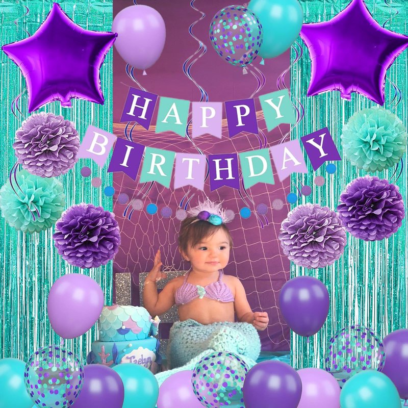 - π Enjoy Mermaid Birthday Party - The mermaid birthday party supplies contains everything you want on the her birthday party. Whether it's a anniversary, birthday, baby shower, wedding party, our teal blue purple birthday party supplies will create a festive atmosphere and make the birthday women feel special and is not only great for photo booth backdrop, but also good for other memories occasions.
