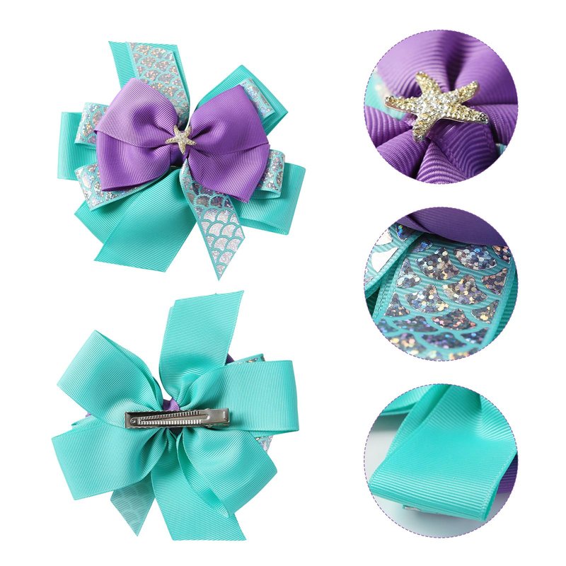 Features: Our Mermaid hair bow clip is made of soft and durable materials. Our costume hair bow can work well on any hairstyle without hurting. The dress up hair bow with starfish is inspired by Mermaid. It is a perfect decoration to thick/thin hair, straight/curly hair. It adapts to Halloween, Christmas, birthday party, anniversary or daily life. Specifications: Material: grosgrain, mental Color: green, purple Style: Mermaid Dimension: 6" x 6" (L x W) Package: 1 x hair bow clip