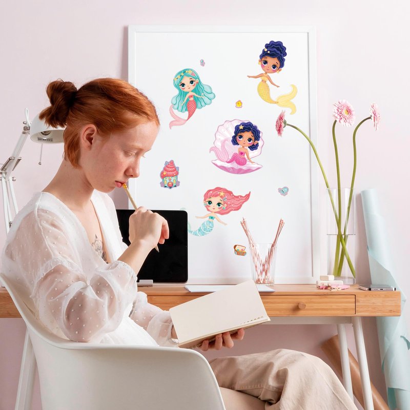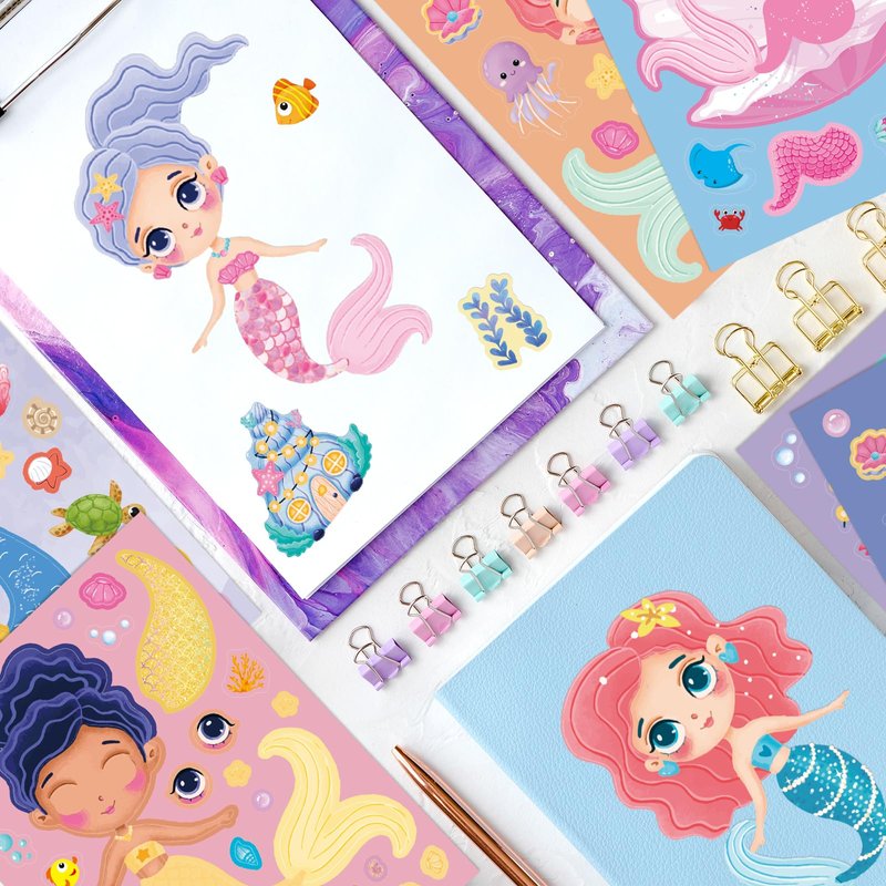 - Cute mermaid design sticker: Cute cartoon mermaid pattern stickers. We design some different mermaid style expression fit for cute cartoon figure, the colorful mermaid with different beautiful dress. Cute stickers for play, add some funny atmosphere.