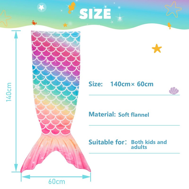 - DREAMY DESIGN - Mermaid tail blanket with rainbow-colored scales is even more dreamy, fulfilling all girls' dreams of mermaids. Wearing the blanket, your girl will look like the beautiful mermaid in the movie.