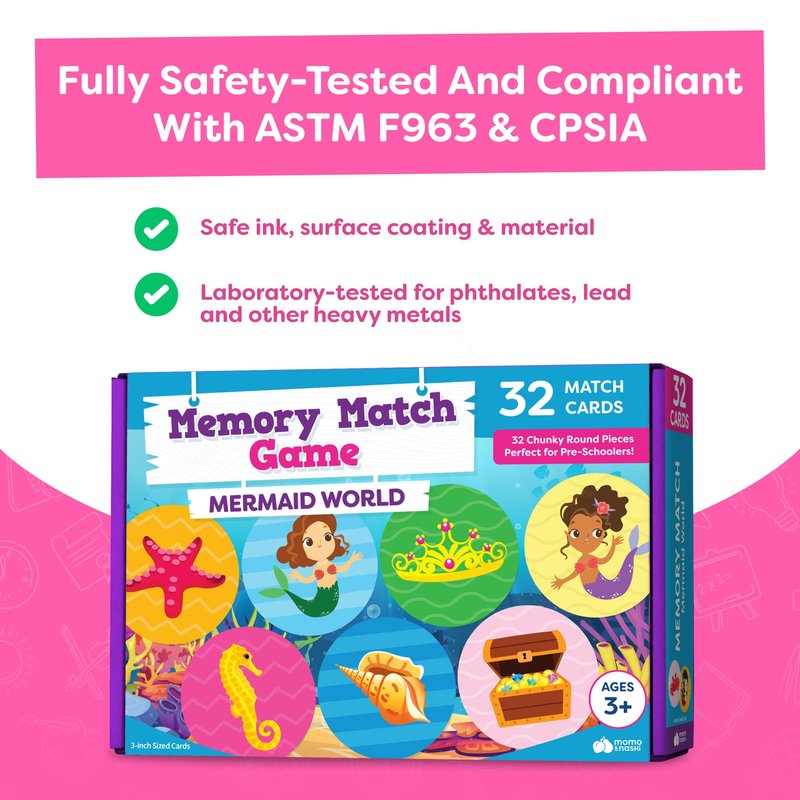 Dive into the enchanting world of our Mermaid Toys Girls Memory Game For Kids, designed to captivate young minds while making learning an absolute joy! This delightful girls toys 4-5 game set are perfect mermaid gifts for girls age 4, combining entertainment with cognitive development. Featuring 16 beautifully illustrated, artist-commissioned matching card pairs, each 3 inches in diameter, this game is an ideal way to enhance memory, concentration, and cognition. Whether played solo or in a group, it's designed for endless fun and learning. The toys for girls 3-5 cards are crafted from durable 3mm chipboard and feature polished, double-sided gloss printing that showcases vibrant mermaid games artwork. Housed in a sturdy, reinforced box, this set is built to last, promising years of enjoyment. Safety-tested and compliant with ASTM F963 & CPSIA standards. Perfect 4 year old girl birthday gifts for preschoolers, ensuring safe and engaging play. Watch as your little ones develop a love for learning that will last a lifetime with this high-quality memory game!