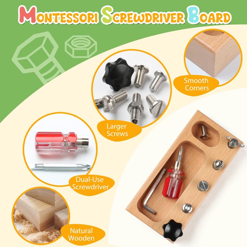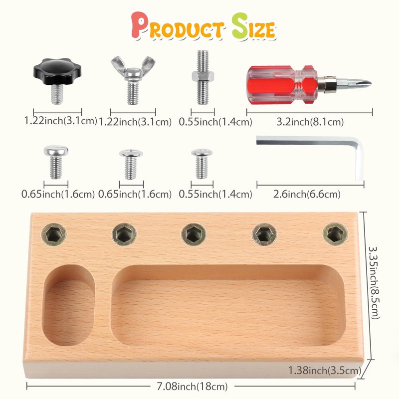 Montessori Screw Board with 6 x different screws, 1 x bench wooden screwdriver board, 1 x double-ended screwdriver, 1 x hex key. Notably, our screws are larger than others, ensuring an optimal grip for little hands. this wooden toy fosters practical life skills, allowing toddlers to confidently use a screwdriver, handle various real tools,all while experiencing joy and building confidence.