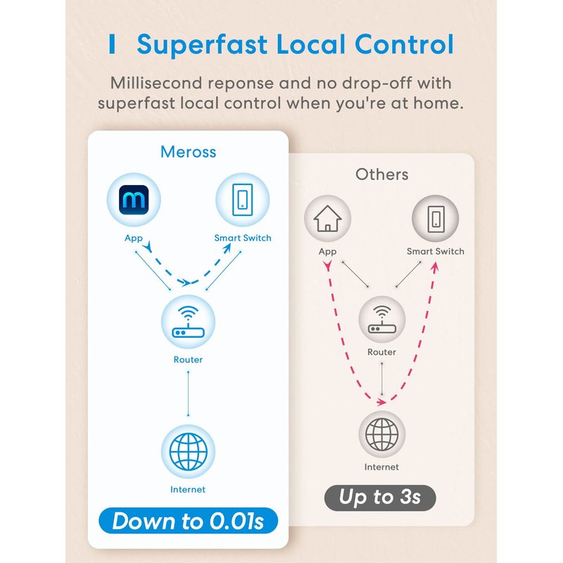 The Smart Light Switch MSS510HK can be controlled from anywhere (Internet Required) with your Meross app (iOS 13.0 or later). It allows you to turn the connected lights or fans on and off, and to set schedules or auto-off timer routine around your daily needs. Additionally, after pairing with Amazon Alexa or Google Home, you can simply control the connected devices with voice commands.