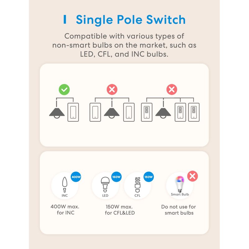 - Easy to Install: Less than 15 min installation. Works in a single pole setup only(Not 3 Way). the smart switch fits for your existing 1/2/3/4 gang standard size Decora/GFCI faceplate. The smart switch works with 2.4GHz Wi-Fi only, does NOT support 5GHz Wi-Fi, and no hub required.