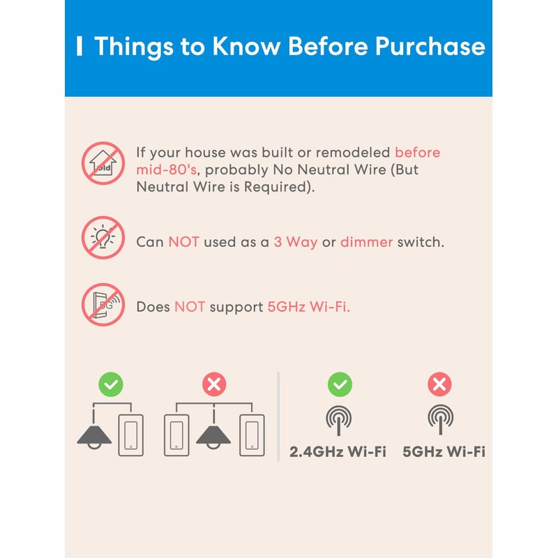 - Neutral Wire Required: Please make sure your electric box has a neutral wire(in white color) before purchasing Smart Light Switch. If you are not sure, please take a photo of the inner part of your electric box and send it to us. We can check it for you timely.