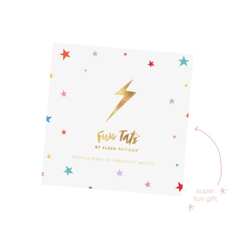 These Flash Tattoos are ready to party! Celebrate in style with the “MERRY AND BRIGHT" variety set featuring 25 festive holiday inspired designs that are perfect for gifting, parties and celebrations. -(5) 'HOLIDAY CANDY CANE' temporary tattoos on a 1.5” X 1.5” card -(5) 'COLORFUL CHRISTMAS TREE’ temporary tattoos on a 2” X 2” card -(5) 'JOLLY SANTA’ temporary tattoos on a 2.25” X 1.5” card -(5) 'HOLIDAY PRESENTS' temporary tattoos on a 2” X 2” card -(5) 'SILVER FROST SNOWFLAKE' temporary tattoos on a 1.5” X 1.5” card -Individually printed and pre-cut for quick application at events -Simple application and removal instructions on the back of each tattoo card -Premium metallic foils, color inks, and adhesive lasts 2 - 6 days with proper care -Non-toxic and safe for all ages, but not recommended for children under 3 years old. -Packaged in a resealable metallic pouch with 2 complimentary -Flash Off remover wipes *Quantity refers to individual sets of 25. Ex: Selecting a quantity of ‘2’ means you receive 2 sets for a total of 50 tattoos. Get Inspired | Apply party tats at events, tuck a surprise tat into invitations and thank you notes, use them as party favors, stick them onto glassware, wine bottles, favor bags, vases, candle jars…the possibilities are endless!