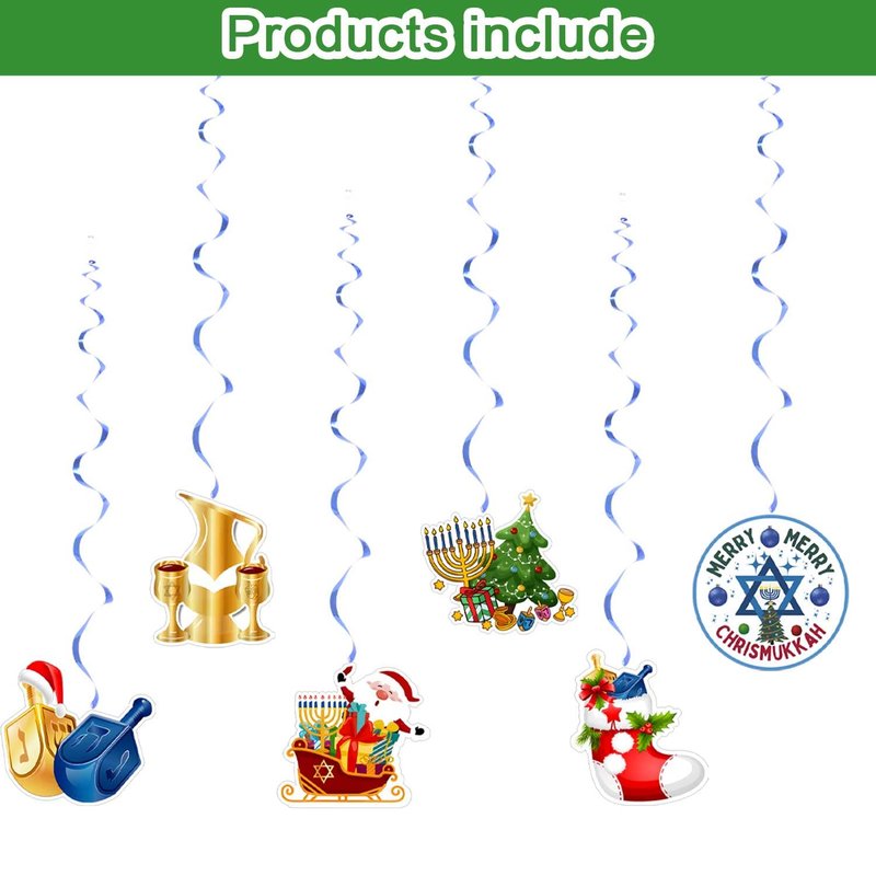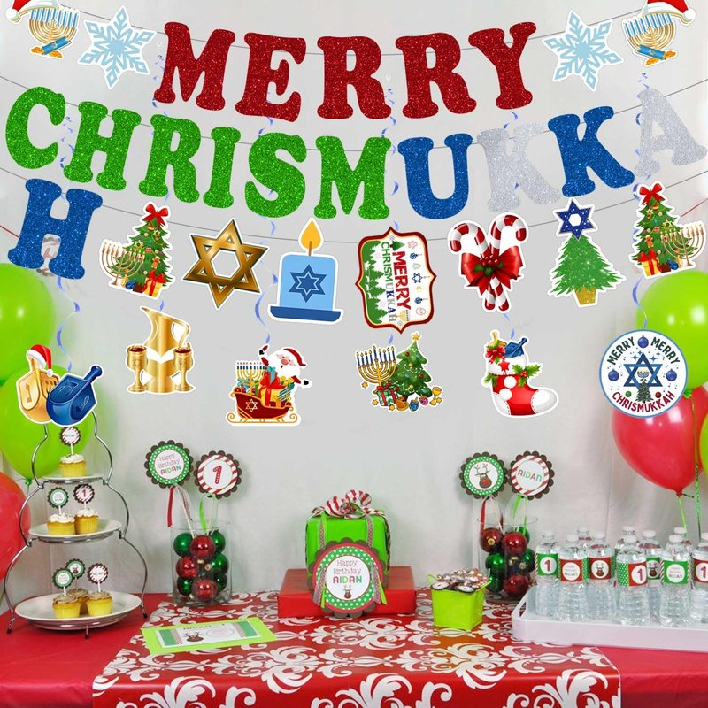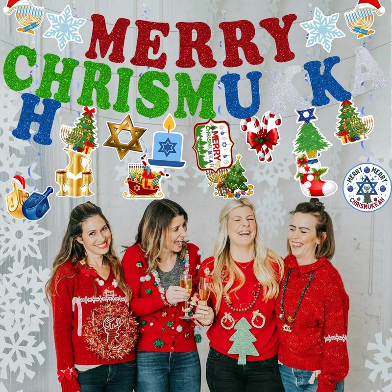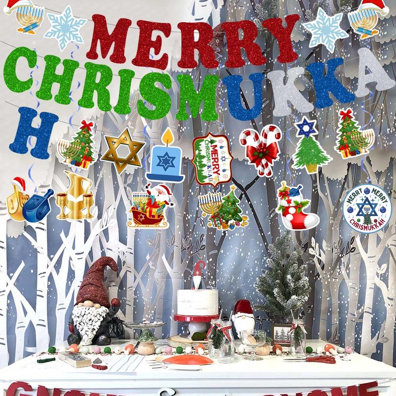 - Package includes: you will get 1 pcs Merry Chrismukkah banner, 1 pcs Chrismukkah theme banner and 6pcs Hanukkah Christmas decorations card stock,6 pcs whirls glitter foil ceiling swirls streams, and clear plastic hooks for hanging, It can be applied to many places, such as the fireplace, wall, front door, stairs, window, yard, balcony, etc., to create a Chrismukkah festive atmosphere.
