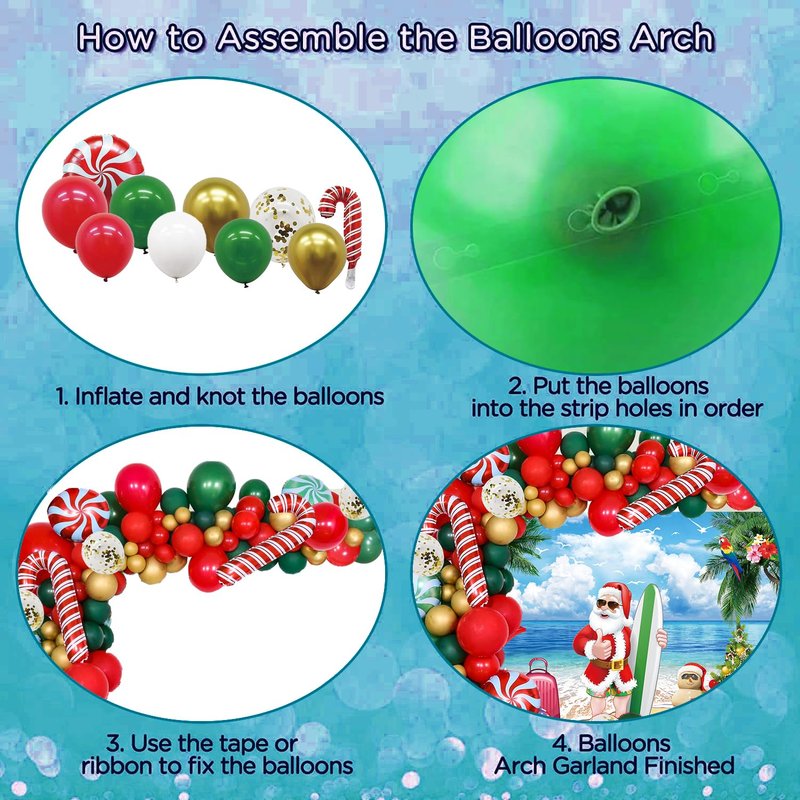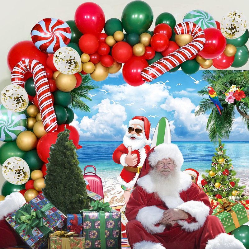 - 【Summer Christmas Party Decorations】Package included 1 pcs Santa Claus backdrop, 20 red balloons, 20 green balloons, 10 metallic gold balloons, 5 white balloons, 5 gold sequin balloons, 2 candy cane balloons, 2 round candy balloons, 1 roll of balloon chain, 1 roll of balloon dotting glue, 1 roll of balloon ribbon.