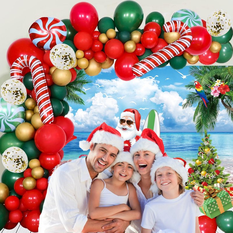 Merry Christmas Party Decorations Kit, Christmas Balloon Arch Garland Kit with Red Green Golden Candy Balloons, Summer Hawaiian Christmas Backdrop Banner,Tropical Beach Xmas Party Decors Supplies