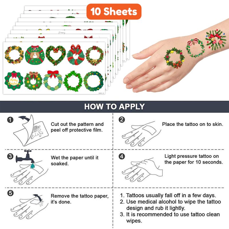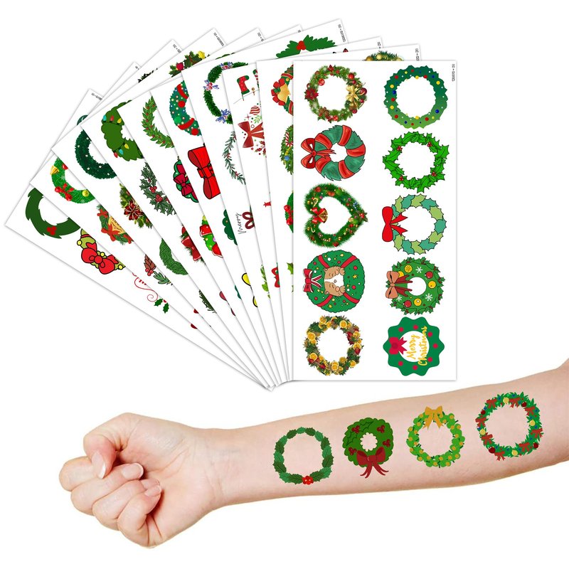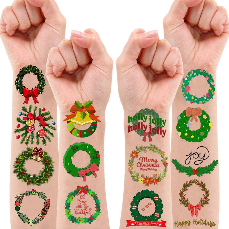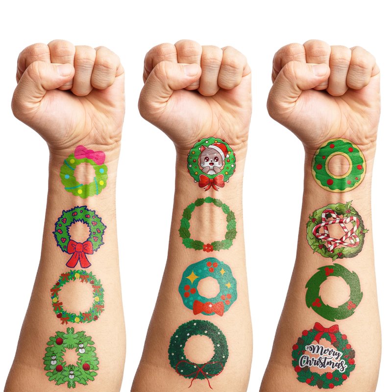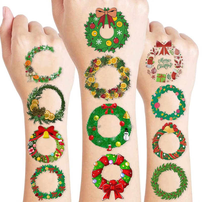 - What You Get: We would like to provide you with ten sheets tattoos for the little one, including various styles, sufficient in quantities and styles to meet your daily requirement of using and decorating. They can easily use this set of Cute Christmas Wreath party decorations temporary tattoos and take unique photos to make fond memories. The size of each sheet is 6.1 * 3.1 inches.