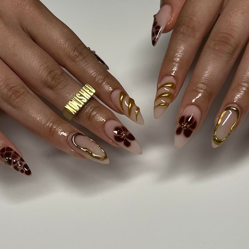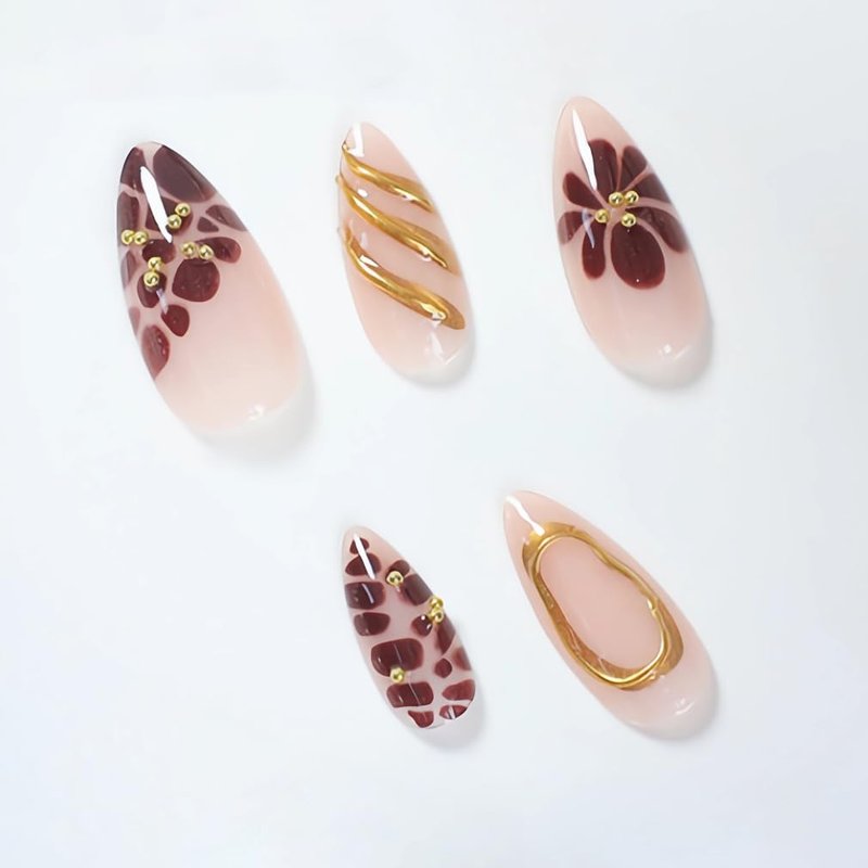 MERVF Almond Press on Nails Medium Fake Nails Brown French Tip Glue on Nails Press ons Flower Acrylic Nails Gold Stiletto Fall False Nails with 3D Design Glossy 24pcs
