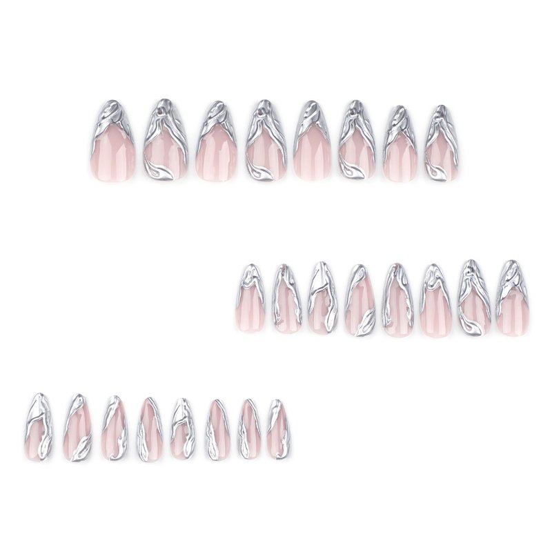 MERVF Medium Press on Nails Almond Fake Nails Press ons 3D Sliver French Tip Glue on Nails Goth Stiletto Acrylic Nails with Chrome Design 24pcs Glossy
