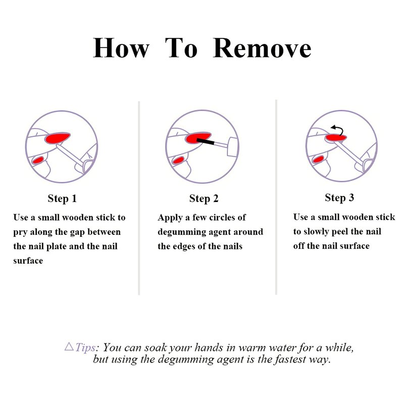 1.Soak your hands in warm water for a while or Apply a few circles of degumming agent around the edges of the nails.