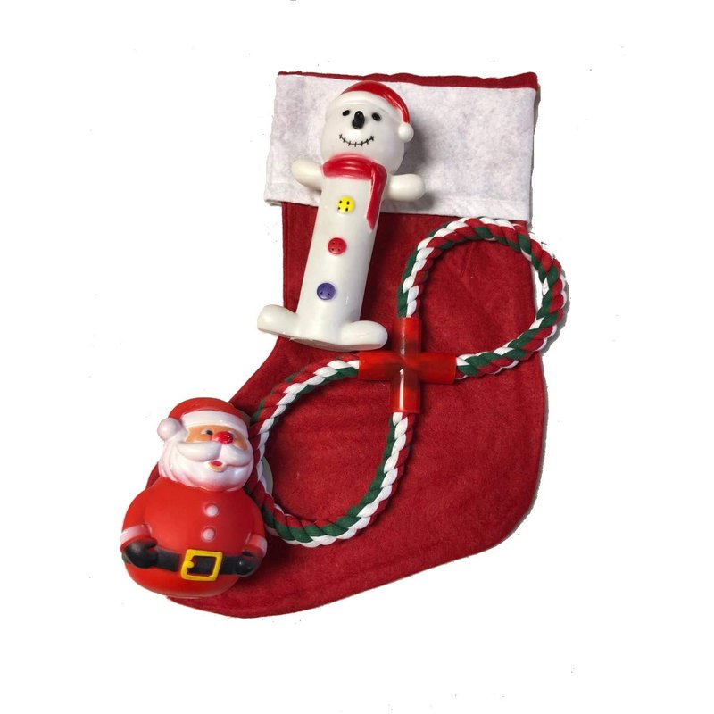 Included in each stocking is (1) rope toy, (1) approximately 7.5 inch squeaky chew toy, & (1) approximately 4.5 inch squeaky chew toy