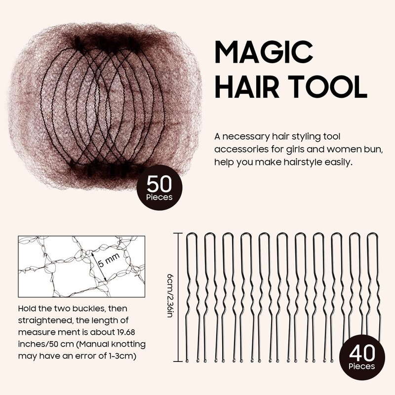 - 【Perfect Hair Bun Maker Set】You will get 50 pieces hair nets, 40 hair bobby pins. Hairnet can keep the hair tidy. It will not harm the hair or put pressure on the head. It’s a perfect hair bun styling kit for both women and girls kids teens.