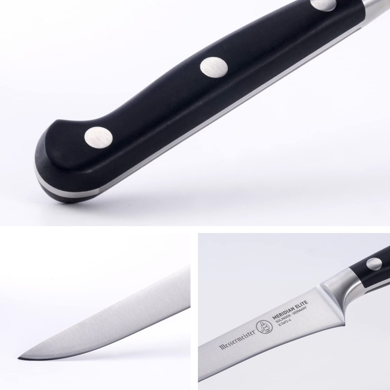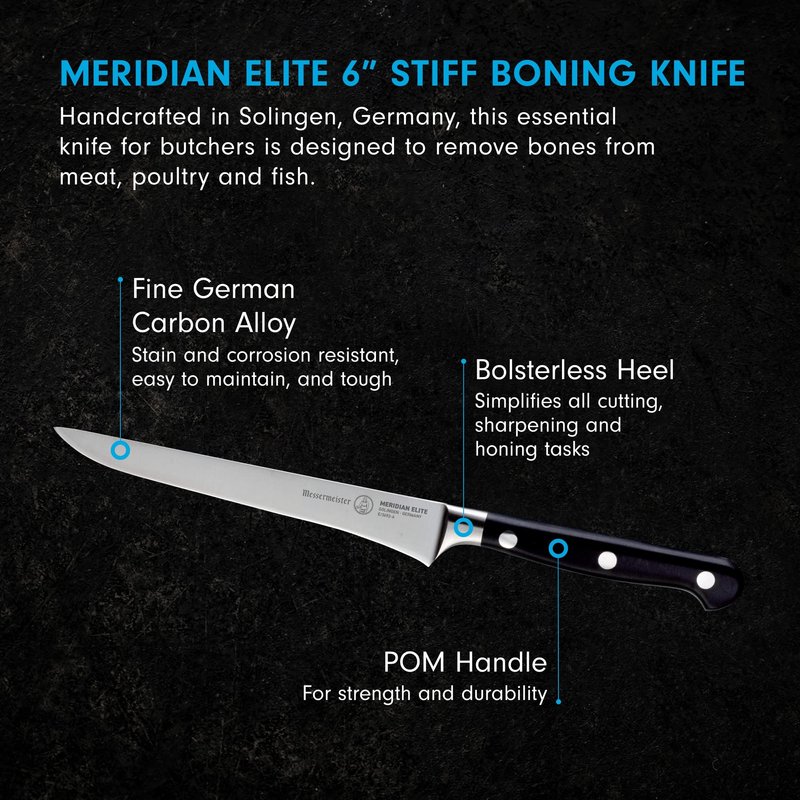- BONING KNIFE - Meridian Elite knives define tradition with the triple-rivet, full-exposed tang series. Handcrafted in Solingen, Germany, they are one piece, hot-drop hammer forged for a sharper knife with POM handles for comfort and durability.