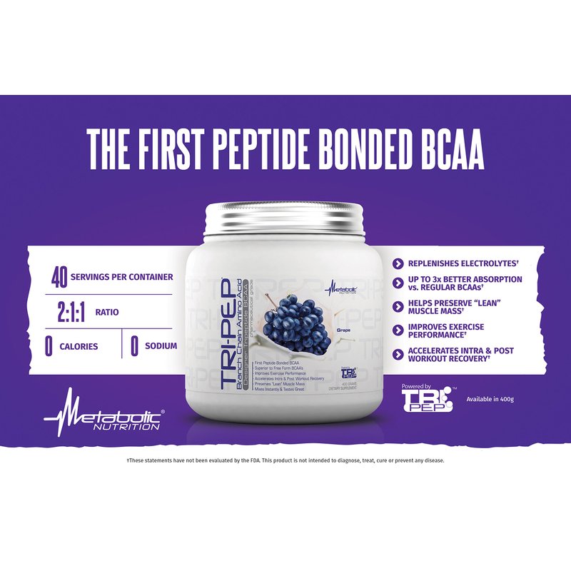 - TRI-PEP from Metabolic Nutrition is a Peptide-bonded 2:1:1 BCAA for maximum absorption which Dramatically improves post-workout recovery, increase and stimulates Muscle Protein Synthesis, reduce Muscle Breakdown and promote Muscle Recovery & Repair and reduces muscle soreness and fatigue