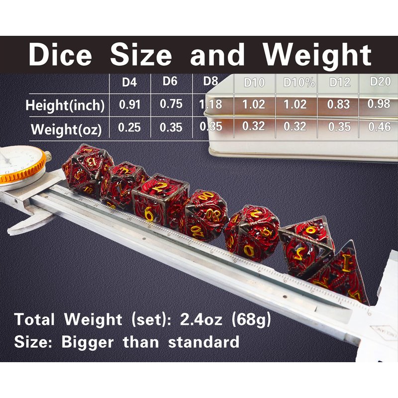 - đ˛ăAmazing Experienceă: This DND dice is made of metal material. Compared to ordinary metal dice, this set is larger in size but lighter in weight. Its texture provides an excellent touching experience, and creates crystal clear sound like a wind chime whey in collision, which makes users so much fascinated.