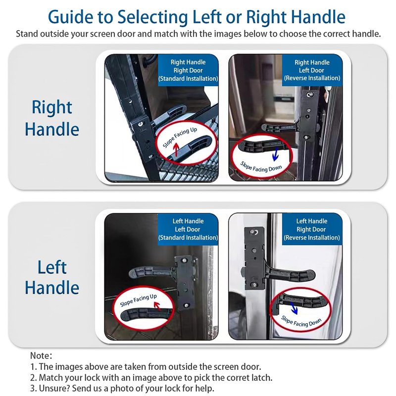 Durable Construction: Our door latch is built to last, boasting a robust zinc alloy handle that's designed for longevity. The additional parts are crafted with high-quality plastic, ensuring a blend of sturdiness with sleek aesthetics. Optimal Compatibility: Complemented by black powder-coated stainless steel screws and washers, our latch not only provides a seamless fit but also complements your RV's exterior design seamlessly. All-in-One Kit: Every package comes complete with everything you'll need - 1 door handle, 1 rectangular plate, 1 square latch, and 6 screws with washers. This ensures a hassle-free replacement experience. Simple Installation: Our design prioritizes user-friendliness, allowing even the most novice of RV owners to install the latch with ease. No professional help required! Enhanced Security: Beyond its aesthetic appeal, our latch promises to bolster the security of your RV. Its reliable closure mechanism ensures peace of mind, knowing that your RV remains protected. Whether you're looking to replace an old latch or enhance the look of your RV's exterior, our product promises a blend of durability, style, and functionality. Remember: always stand outside your screen door and compare with our guide images to pick the right handle for your set-up.