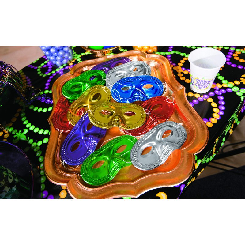 Every party is more fun when guests are in disguise! Hand out these plastic metallic masquerade masks to party guests to add a touch of mystery to your costume party. They’re a masquerade costume all by themselves! The perfect costume accessory for New Year’s Eve or Mardi Gras! Includes elastic band. (2 dozen per unit) 6 3/4"