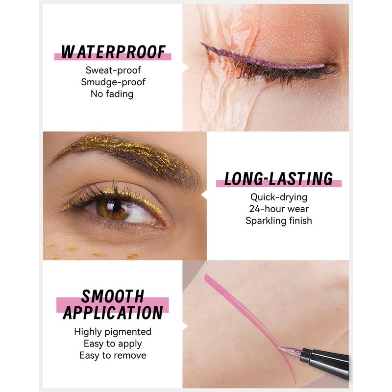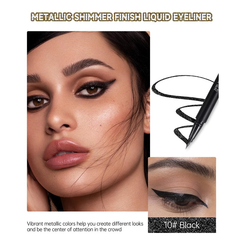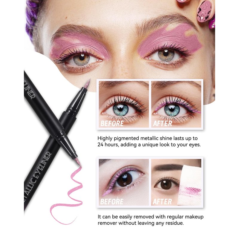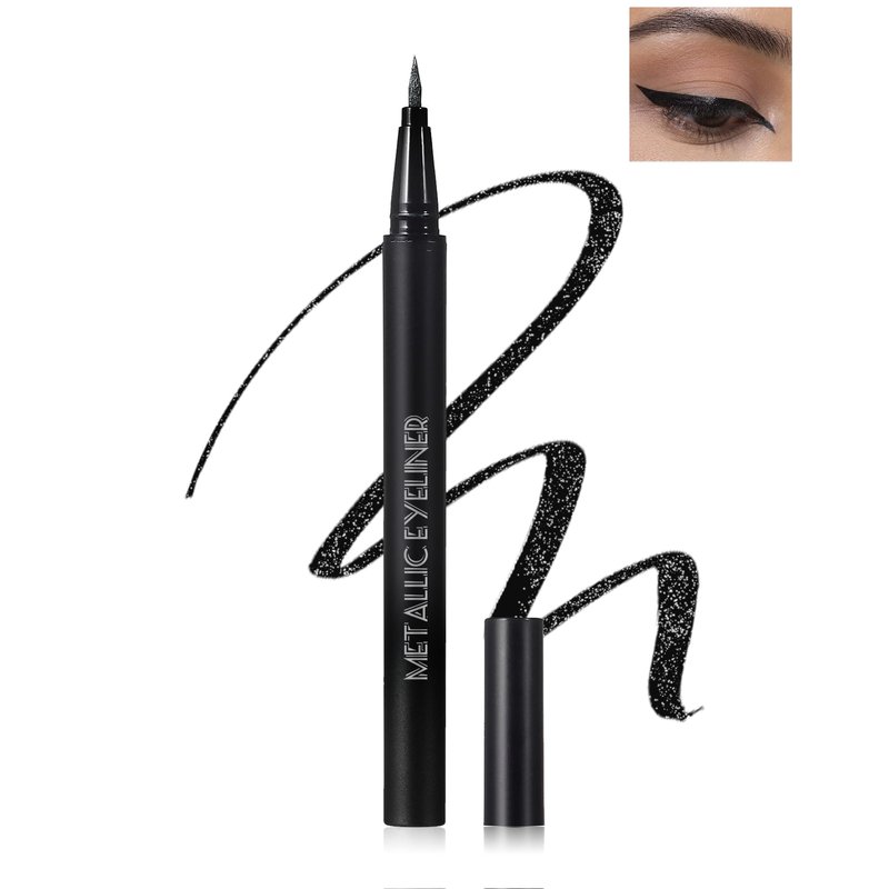 - Metallic Glitter Effect - Shimmer eye liner with metallic glitter particles is vegan and cruelty-free, lightweight on the eyelids, making it easy to wear all day long. Highly pigmented metallic shimmer adds a unique look to your eyes.