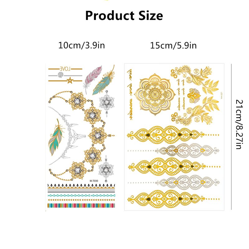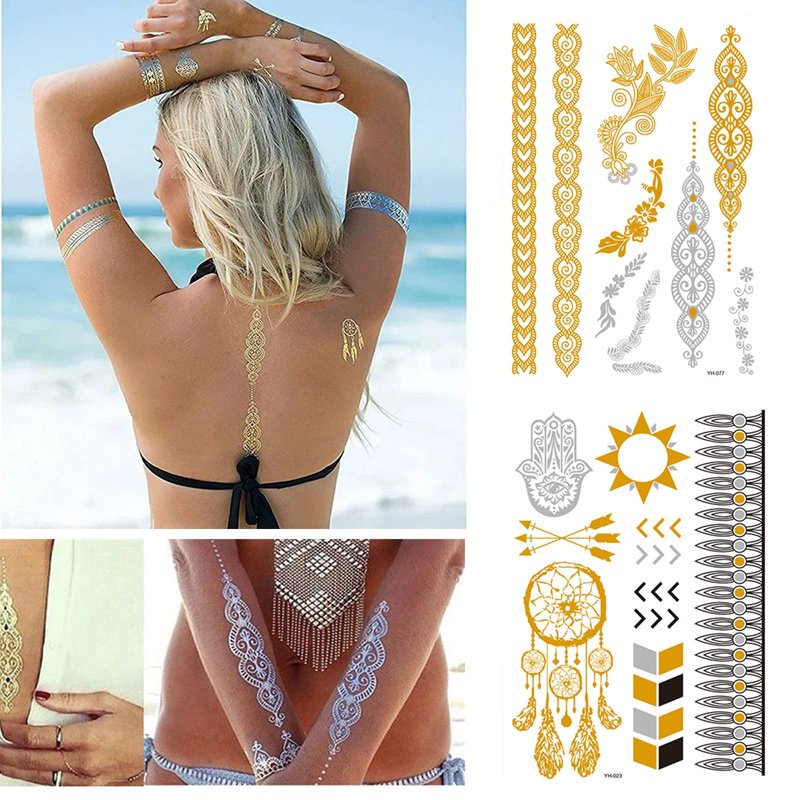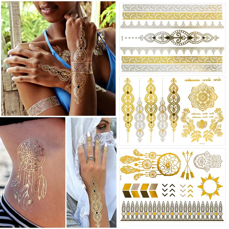 - Premium Quality: 12 Sheets exquisite gorgeous metal tattoo designs, with very high quality. Nice metallic shine and these metallic temporary fake tattoos will stay on for several days. Great & fun metallic temporary tattoos, many designs for you to choose.
