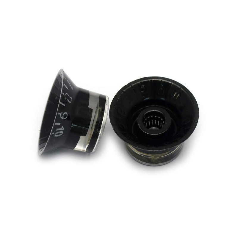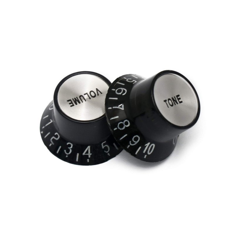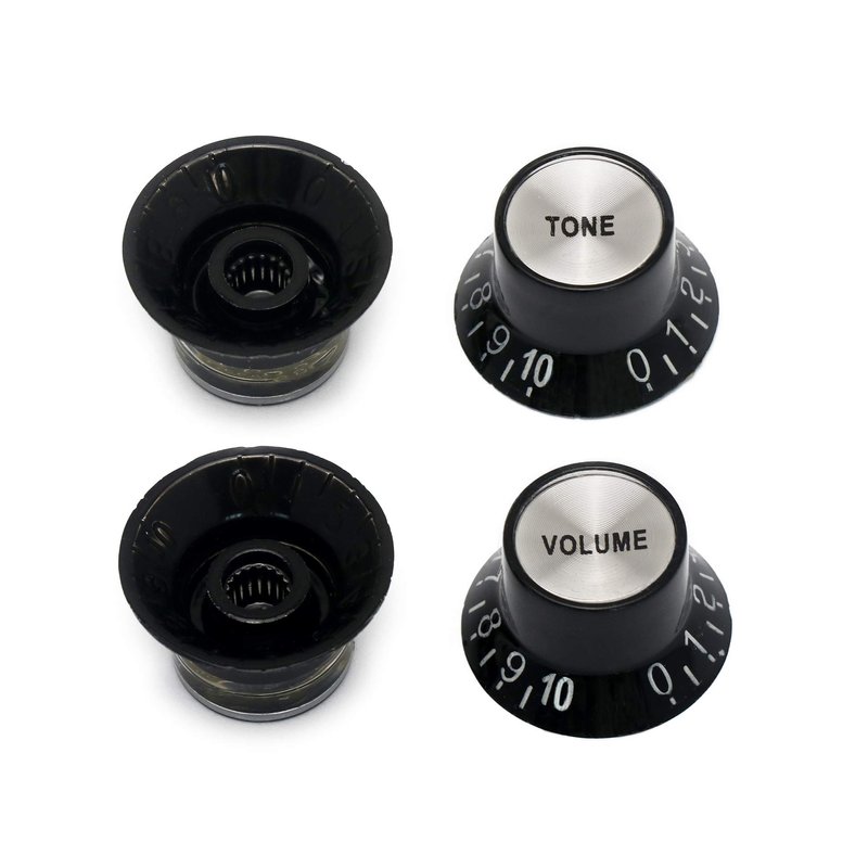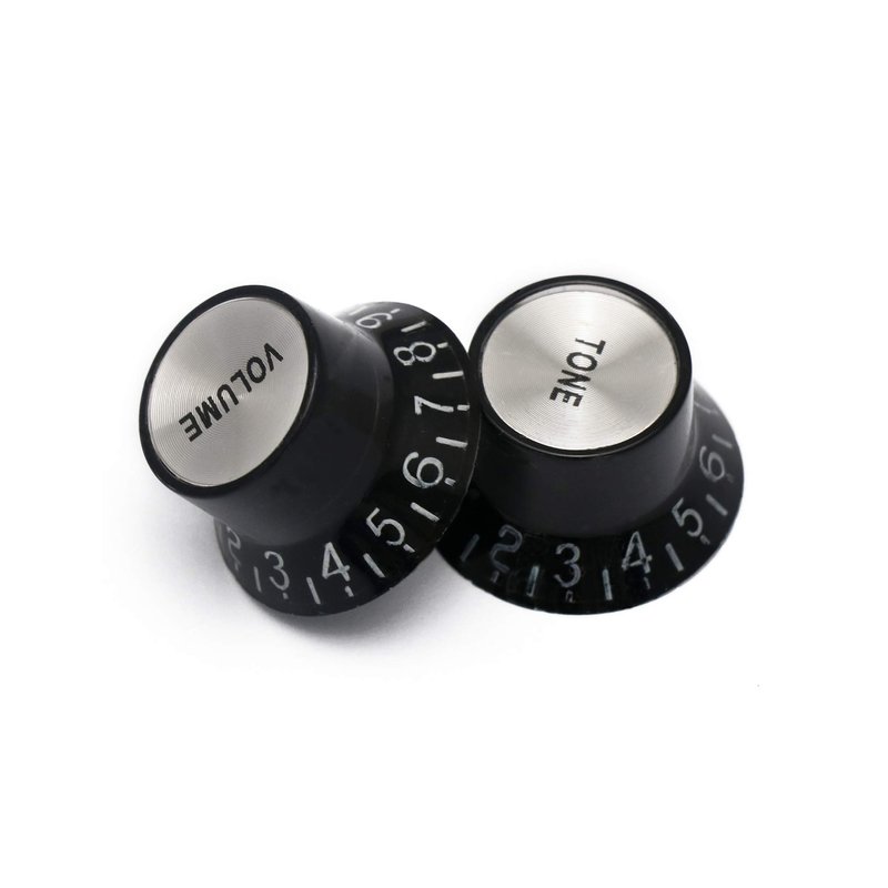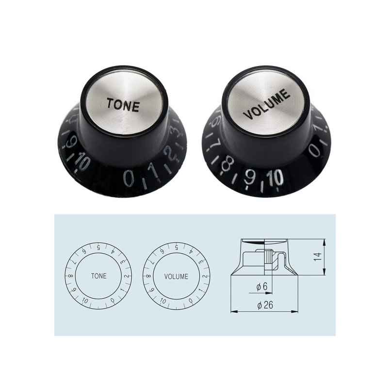PRODUCT DESCRIPTIONTop quality knobs for electric guitars, Volume & Tone, in colors, Black.Push fit, there are identical spec, as fitted to many top range guitars. The VOLUME & TONE words are very fine and precisely printed on the cap insert. Designed to fit split shaft 6mm with 18 spline pots. Can also be used on a range of electric guitars including: Les Paul style electric guitars. ABOUT USMetallor is a branch of Sunsmile Group,which was had over 20 years of experience in the musical instrument field. We are the leading company that can supply a full range of guitar parts, such as necks, bodies, hardware, pickups etc. Our precise production equipment and experienced staff assure you of the finest quality parts. Cooperating with guitar manufactures, our parts are widely used on famous guitars, musicians, repairers, luthiers and factories deserve Metallor’s quality parts and professional service. As one member of the world’s largest top 225 manufacturers, we provide a one-step service for other Sunsmile products. If you have any questions before, during or after purchase, please feel free to contact us.