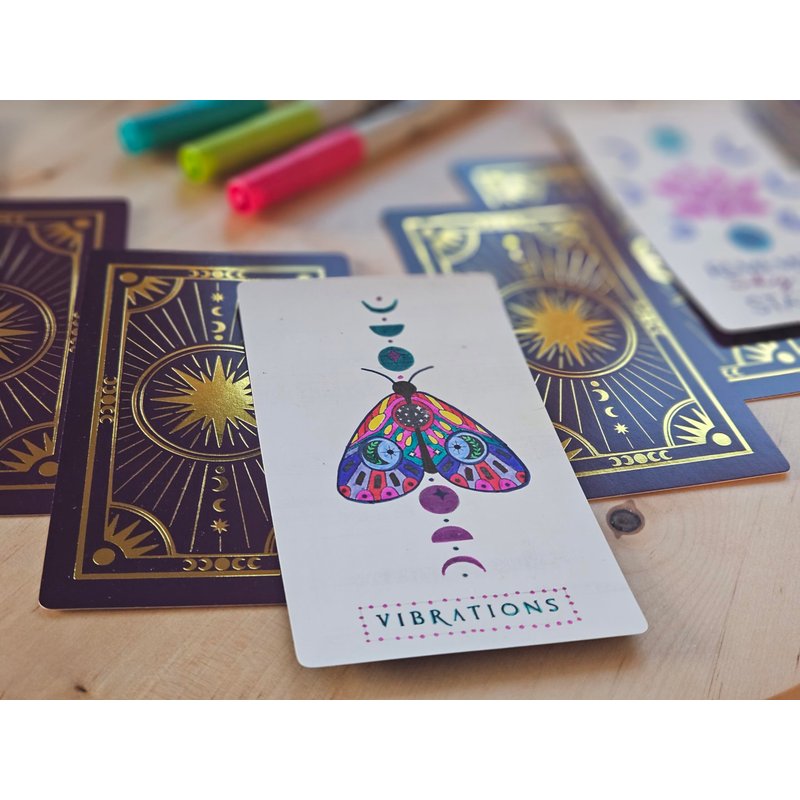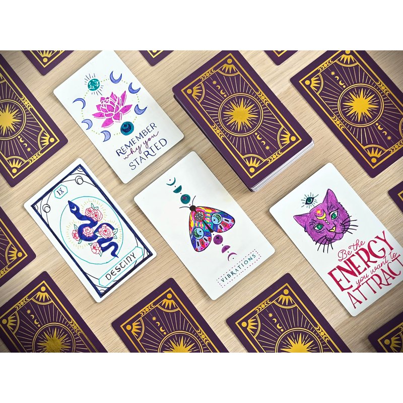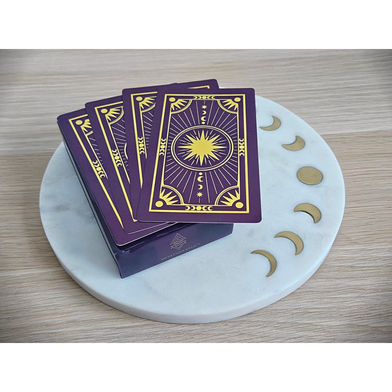 This pack of 80 Metaphoracle blank oracle cards is the perfect canvas for your personalized tarot creations! Each card boasts a printed design on the front, adorned with captivating metallic gold foil accents, while the back remains blank, inviting your artistic touch. Crafted with a durable 320 gsm paper thickness and sized at a standard tarot size of 70mm x 120mm, these cards are perfect for DIY tarot decks. With 80 cards in the pack, you have the flexibility to create a complete 78-card Tarot deck or fashion multiple smaller decks. Unleash your creativity and initiate profound conversations with your intuition and the Universe. These cards serve as the ideal medium for to create your own oracle deck, enabling you to seek guidance and answers for life's significant questions. Fine-tune your divination skills and fulfill your unique divining needs with these versatile and enchanting oracle cards.