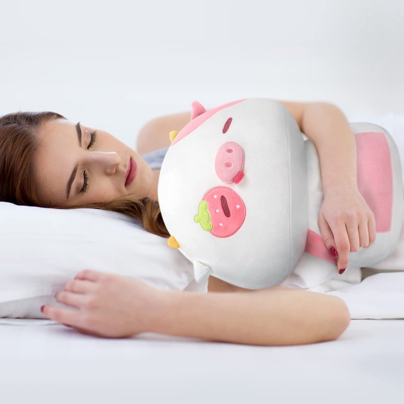 - Strawberry Cow Pillow Cute Design: With its lovely and lifelike Cow stuffed animal pillow, a smiling appearance, and soft fabric. All bad emotions and work stress will disappear when you embrace stuffed toys! This axolotl plush can accompany you or your friends through lonely times.
