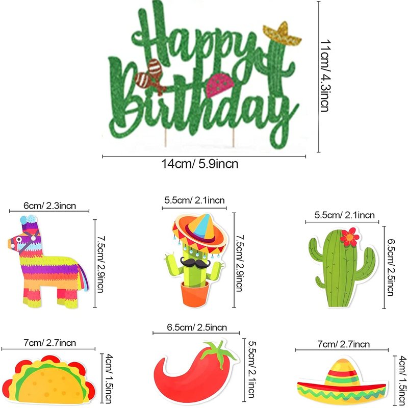 - What Will You Get: 1 x HAPPY BIRTHDAY banner, 1 x big Mexican cake topper, 6 x Mexican small cake toppers, 8 x hanging swirls in 8 styles (Mexican chicken roll, Mexican sombrero, Cactus, Mexican Cinco Rainbow Donkeys, Guitar). A nice combination for you to throw a unforgettable birthday party