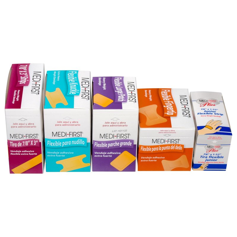 Keep your shop and office first aid kit fully equipped with the Comprehensive Bandage Assortment refill pack. It includes 50 small bandages, 40 flexible fabric knuckle bandages, 40 fingertip bandages, 50 junior bandages, and 25 large patch bandages. These latex-free, skin-friendly bandages backed by Medifirst adhesive technology offer superior adhesion, even when wet, and provide gentle and effective care for all skin types. The comfortable and versatile design allows them to conform to various body parts, ensuring optimal coverage. Effortless dispensing through labeled, easy-to-use dispenser boxes in English and Spanish ensures you never run out of essential supplies.
