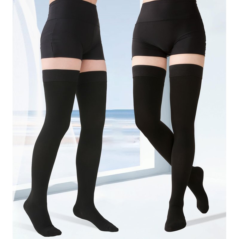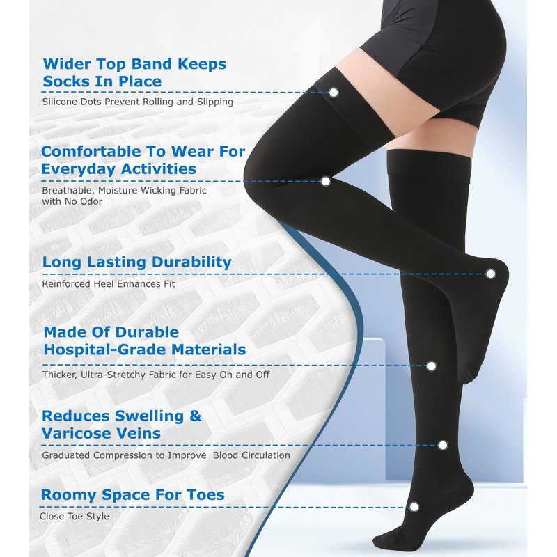 - All Day Comfort: Silicone grip dot-top lining prevents rolling and slipping, which helps the thigh high support socks stay in place all day; High-quality medical fabrics - 70% Nylon, 30% Spandex - air-covered spandex thicker yarn soft touch, comfortable all day wear. Roomy closed toe box will not compress toes and eliminates pressure and chaffing on sensitive feet; Moderate Support, Unisex Thigh Highs, Doctor-recommended, MGANG 20-30 mmHg graduated compression thigh high support stockings!