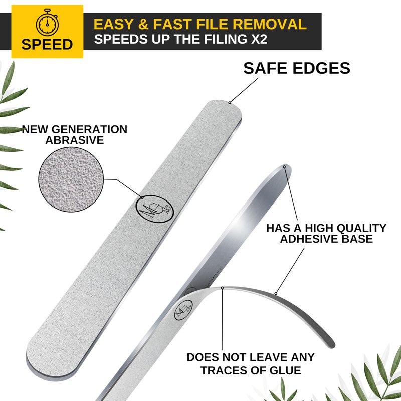 Professional replaceable files for premium segment files on a thin or foam base. High and consistent MGart quality. Made from Japanese sandpaper from a niche leader producing high quality abrasives. They are distinguished by great hardness and abrasion resistance. Well suited both for working with natural nails and for correcting artificial nails. Designed for nail technicians, nail studios, beauty salons, as well as home use. A file with replaceable nail files makes the procedure quick, high-quality and hygienic. The silicone adhesive layer reliably fixes the coating and is removed without leaving a trace, leaving the surface perfectly clean, which saves time on preparation for the next clients. The base of the nail file, made of high-quality stainless steel, has high elasticity and does not bend. The thickness of the saw blade is only 0.8 mm, which provides convenient access under the free edge of the nail plate. A smart combination of lightness and strength - everything to take the load off the nail artist’s joints, make the manicure or pedicure as comfortable as possible and make it easier.
