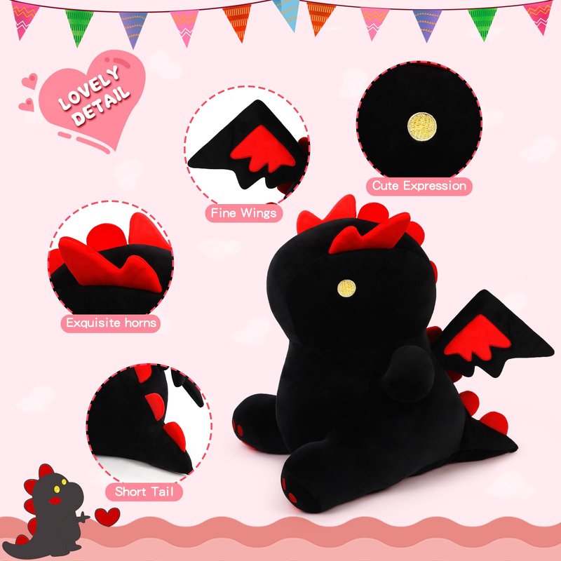 MIAOHAHA Cartoon Funny Plush Dinosaur with Cute Wing, Soft Kids Plush Toy Pillow, Stuffed Animals Dinosaur Toy Gift for Kids and Girls (Black&Red,9.8in/25cm)